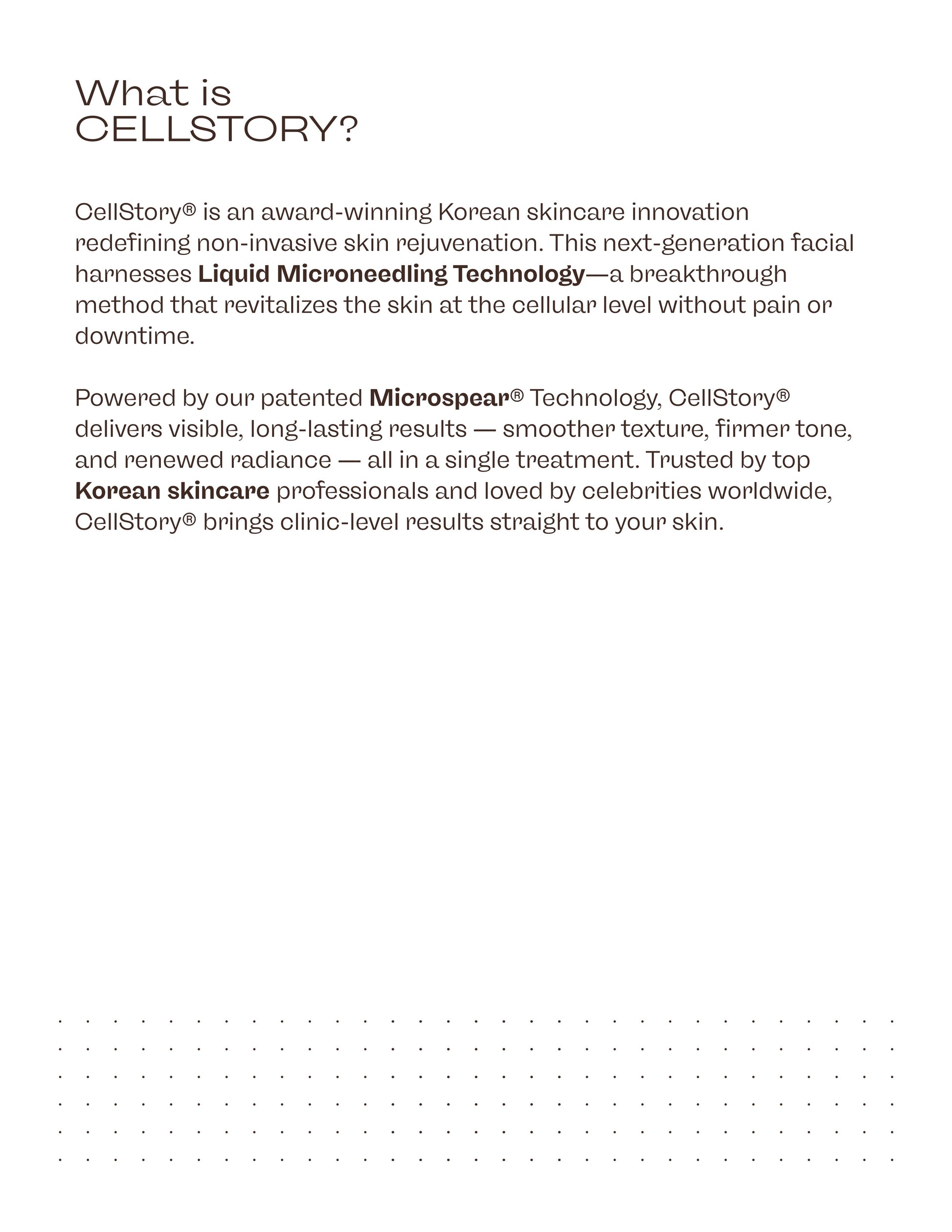 Give your clients a professional introduction to the Cellstory system with our premium printed brochure. Designed for estheticians and studios, this brochure provides a clear, visually appealing overview of Cellstory’s advanced Microspear technology, key benefits, and treatment advantages. Perfect for display in your treatment room, front desk, or retail area.